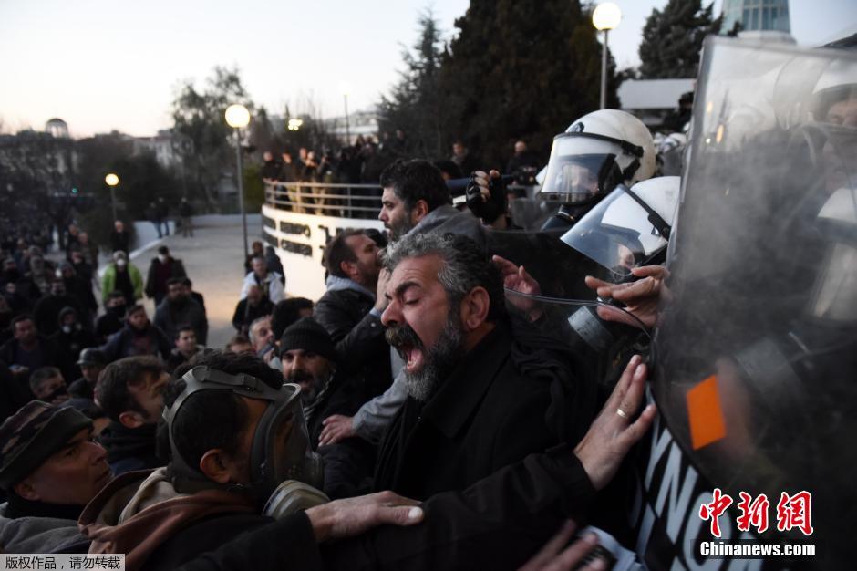 当地时间2016年1月28日,希腊塞萨洛尼基,希腊农民抗议政府实行财政紧缩政策,增加农业部门税收,与防暴警察冲突。约5000名农民在农业博览会外抗议,他们试图重进场馆遭到警方催泪弹驱逐。
