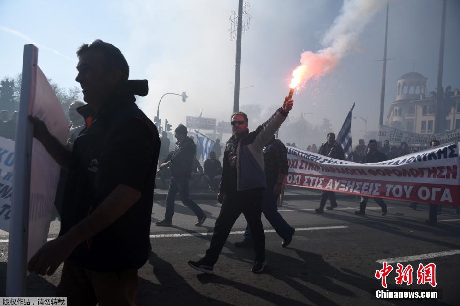 当地时间2016年1月28日,希腊塞萨洛尼基,希腊农民抗议政府实行财政紧缩政策,增加农业部门税收,与防暴警察冲突。约5000名农民在农业博览会外抗议,他们试图重进场馆遭到警方催泪弹驱逐。