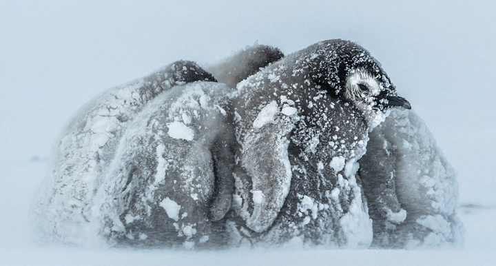 南极帝企鹅宝宝相互依偎抵御暴风雪(高清)