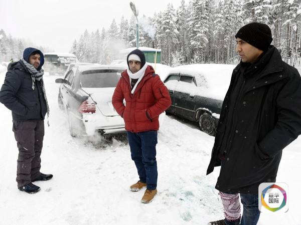 三名难民徘徊在俄罗斯-芬兰边境处,等待许可进入芬兰。(图片来源:新华/法新)