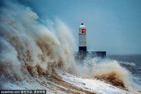 当地时间2016年1月29日,英国南威尔士,当日大风席卷海岸,巨浪滔天,几乎掩盖了Porthcawl灯塔和海港围墙。(图片来源:SIPA)