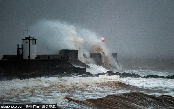 英国南威尔士大风席卷海岸 巨浪滔天景象壮观