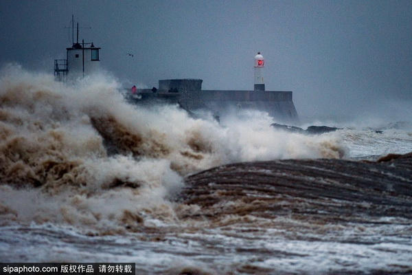 当地时间2016年1月29日,英国南威尔士,当日大风席卷海岸,巨浪滔天,几乎掩盖了Porthcawl灯塔和海港围墙。(图片来源:SIPA)