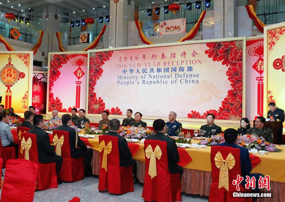 1月29日,中国国防部在北京八一大楼举行2016新春招待会,来自80多个国家240余位驻华武官夫妇应邀出席。 中新社记者 宋吉河 摄