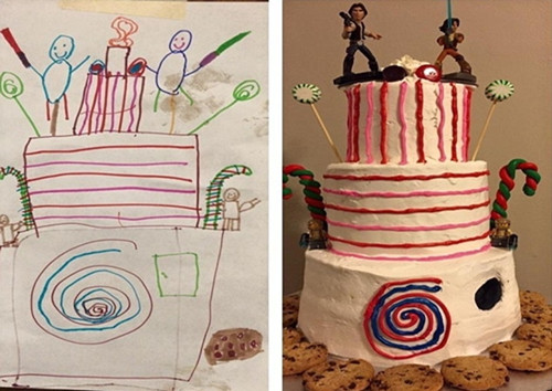 报道指出,身为面包师傅的母亲依循着孩子画的蛋糕图像,在蛋糕上淋上五颜六色的糖浆,放上棒棒糖及饼干装饰,蛋糕图最上方两个人物挥舞着激光剑,母亲特地放上了《星球大战》的人物,这个美味蛋糕一出炉,让孩子又惊又喜。