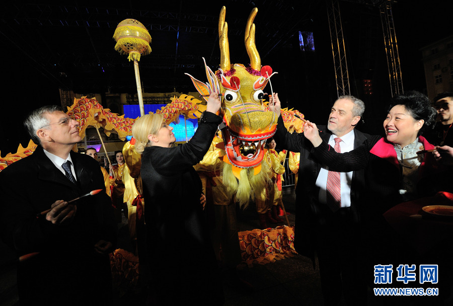 1月30日,克罗地亚总统科琳达·格拉巴尔—塔基罗维奇(左二)、议长赖纳(左一)、萨格勒布市长班迪奇(右二)和中国驻克罗地亚大使邓英(右一)共同为中国龙点睛。新华网发(米绍·利沙宁摄)