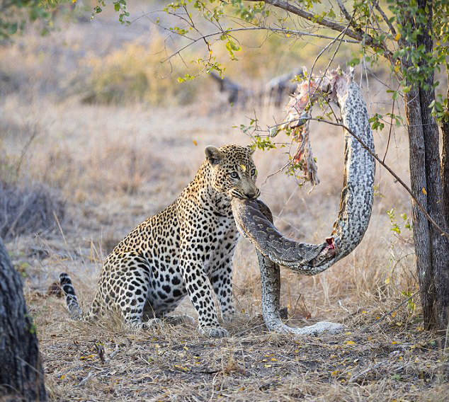 南非摄影师抓拍猎豹拉扯巨蟒尸体(组图)