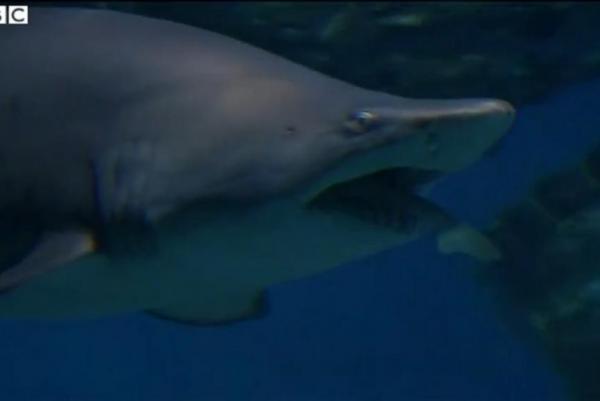 惊悚!韩国水族馆沙虎鲨为争地盘怒吞猎犬鲨(图)