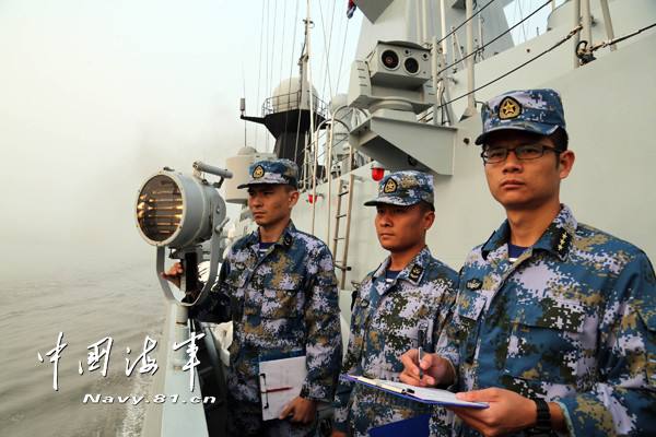 柳州舰官兵与孟海军“班加班德胡”号进行灯光通信。曾行贱摄
