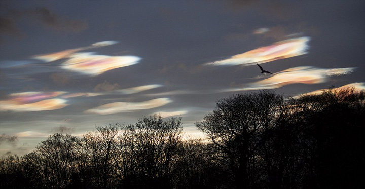 事实上,珠母云常见于挪威以及其它极地区域,形成于距地面近两万多米、极度寒冷的平流层底部,由硝酸水合物以及冰晶构成。傍晚时,太阳虽处地平线以下,阳光仍能够照射在这些冰晶上并发生折射,显现彩虹般的色彩。珠母云虽然美丽,但由于其形成于臭氧层所在位置,并为会破坏臭氧层的光化学反应提供理想的条件,进而造成臭氧层空洞,极具破坏性。