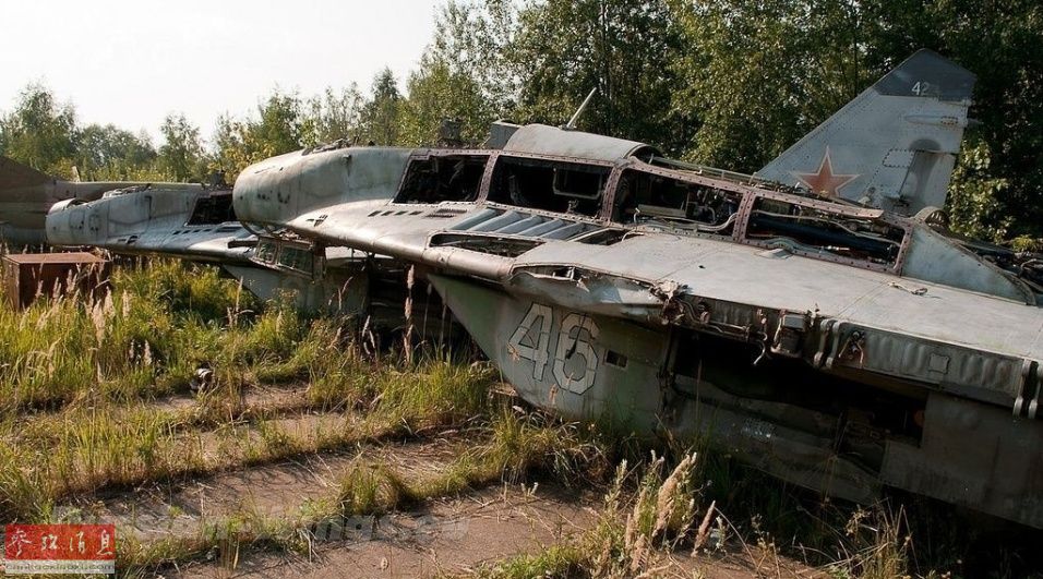 图为位于俄首都莫斯科附近的军机坟场,可见放置在草丛中的米格-29战机。