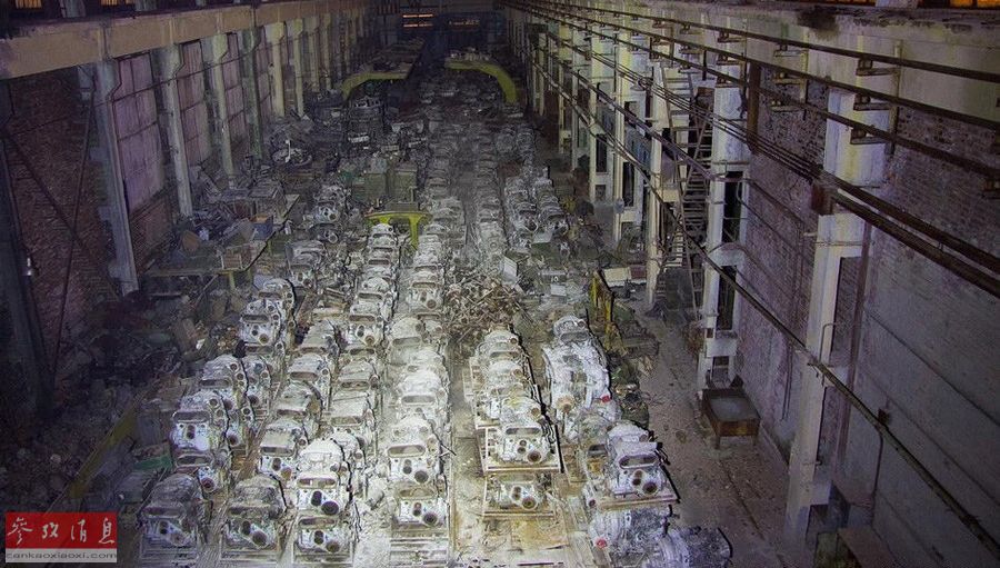 厂房内藏有堆积如山的坦克发动机。