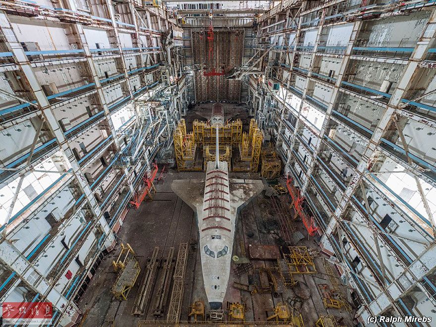 废弃在哈萨克斯坦境内航天发射设施内的“暴风雪”航天飞机。