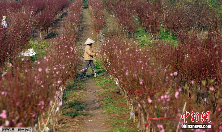 花农在桃树林立整理桃花,等待顾客前来选购。