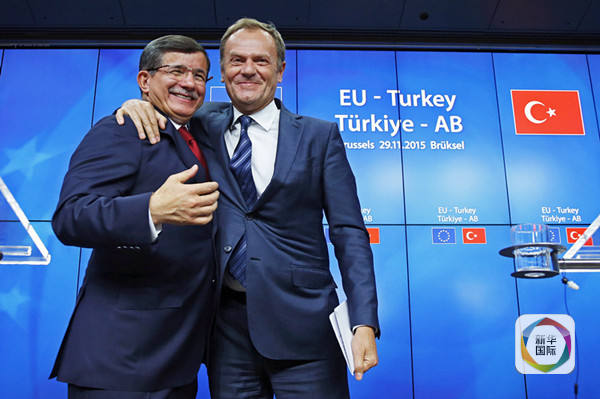 去年11月29日欧盟承诺向土耳其提供30亿欧元以应对难民问题。当日,在比利时首都布鲁塞尔,欧洲理事会主席图斯克(右)与土耳其总理达武特奥卢出席新闻发布会。(新华社/路透)