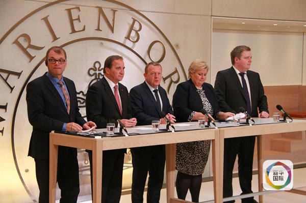 去年10月2日至3日,北欧五国首脑在哥本哈根举行会议,就地区形势、叙利亚及难民等问题进行了交流。图为会后北欧五国总理和首相出席新闻发布会。(新华社记者石寿河摄)
