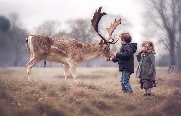 爱尔兰小兄妹喂食牧鹿似梦幻场景(组图)