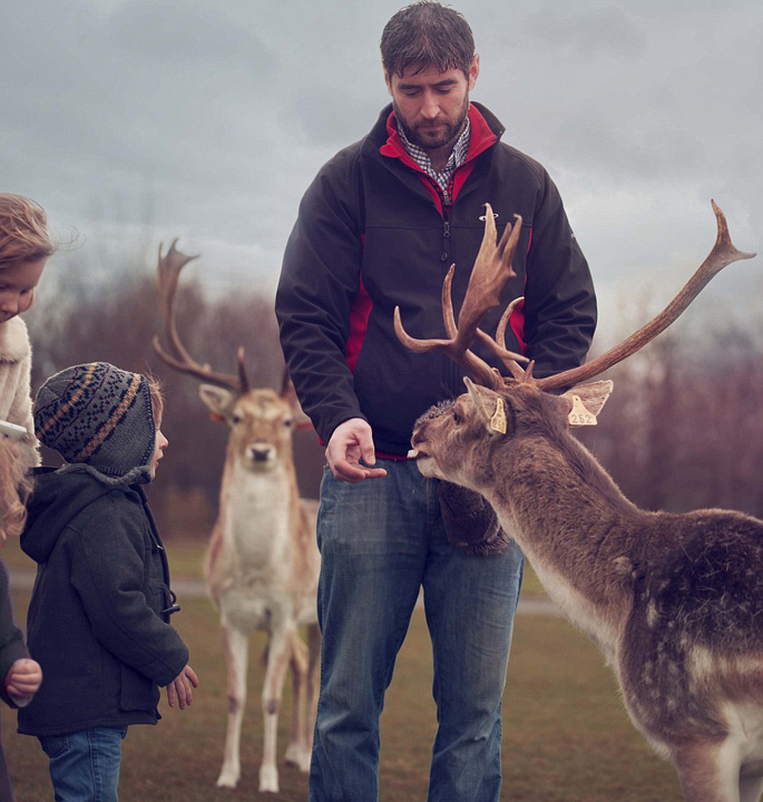 在相关图片中,维多利亚的两岁小女儿芭芭拉·欧文(Barbara Irwin)正把手中的一小块胡萝卜喂给站在她身旁的健硕雄鹿吃。而在此之前,雄鹿巴巴地望着她手中的食物,不紧不慢地等待小女孩喂食。还有她3岁的儿子米歇尔(Michael)也和梅花鹿相处的十分融洽。丈夫罗南(Ronan)也伸手给牧鹿喂食。镜头下的一家人其乐融融,和牧鹿一起度过了开心的一天。