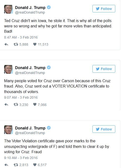 3日上午,特朗普在推特上发起攻势,他对自己的600万追随者说,首度担任德州联邦参议员的克鲁兹在艾奥瓦州党团会议上使用欺诈手段。特朗普说:“克鲁兹并未在艾奥瓦州获胜,他的胜利是窃取来的。这是为何所有的民调结果都错得如此离谱的原因,也是他为何获得远超过预期选票的原因。”