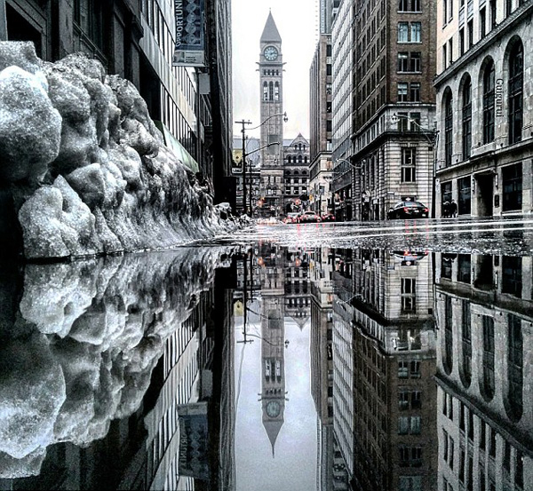“在等待过马路时,我无意间看到地上的水洼,里面倒映着蔚蓝色的天空。一瞬间我就在想象我面前的街道倒映在水中又会是什么样子,我要发掘掩藏在水中的平行世界。”鲁伊斯说道。于是一系列“对影成双”的水面倒映图就陆续诞生了,拍摄的场景涉及多伦多老市政厅、华盛顿联合车站、海湾街、央街(Yonge Street)等地。