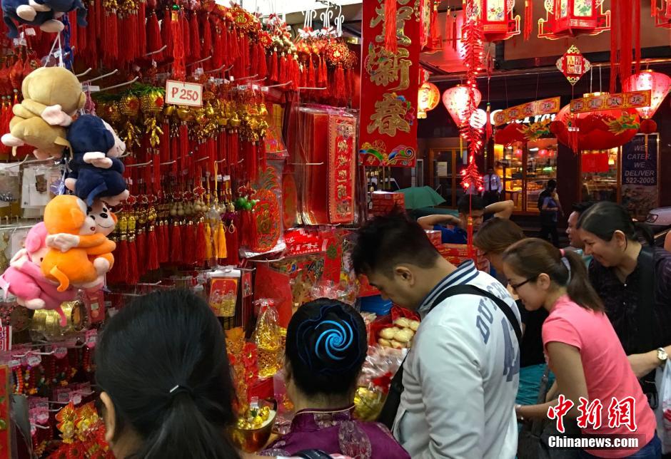 当地时间2月4日,菲律宾首都马尼拉中国城各主要街道上张灯结彩,欢庆中国新年的氛围浓郁。菲律宾政府之前已宣布今年的2月8日为特别非工作假日,让民众一起欢庆中国春节。图为菲律宾民众在中国城采购年货。中新社记者 张明 摄