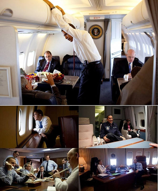 美国总统奥巴马与幕僚工作在“空军一号”。(图片来源:互联网)