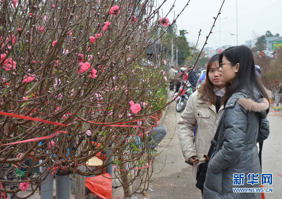2月3日,在越南首都河内,一名顾客挑选桃花枝。春节将至,越南河内民众纷纷到市场上购买鲜花和其他装饰品,迎接农历猴年的到来。 新华网记者闫建华摄
