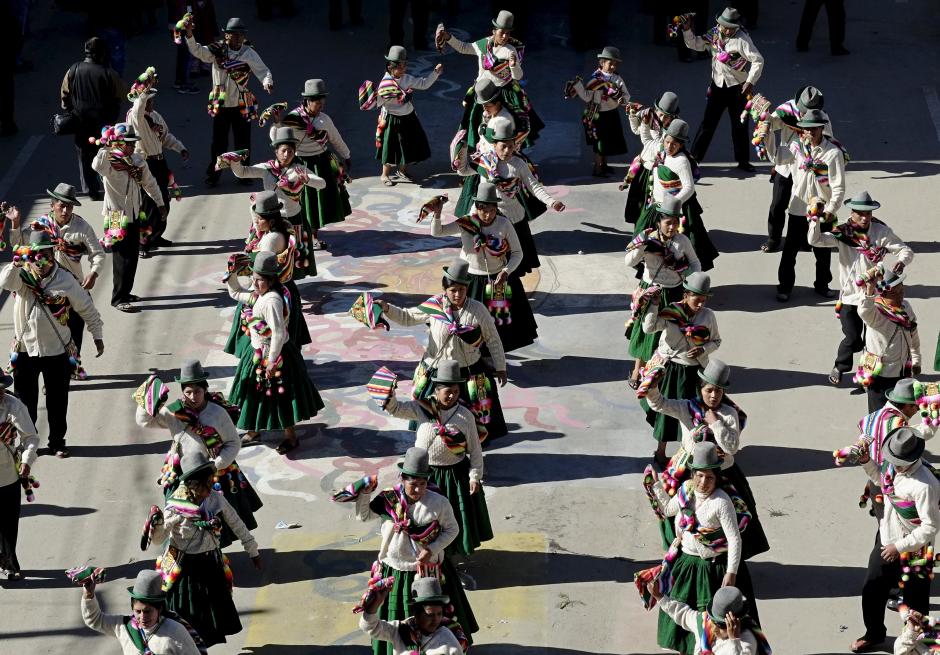 玻利维亚土著居民穿着极具特色的服饰载歌载舞,庆祝其传统节日。