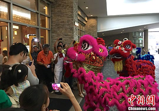 图为大批居民到场围观精彩的舞龙舞狮表演,期待猴年好彩头。中新社记者 张明 摄