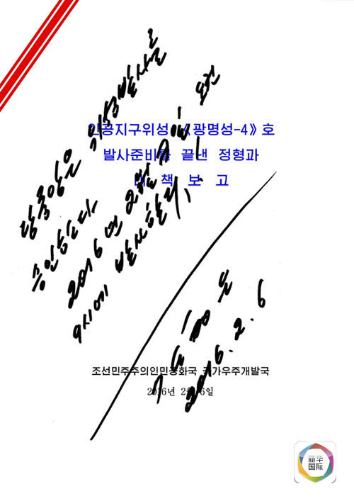 朝中社2月7日提供的照片显示的是朝鲜最高领导人金正恩于2月6日签署的“光明星4号”地球观测卫星发射的最终命令。(图片来源: 新华社/朝中社)