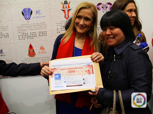 图为马德里自治区主席克里斯蒂娜·西富恩特斯(左)向全球华人拜年。右为新华社驻马德里分社记者冯俊伟。