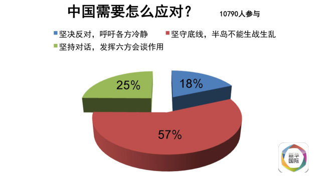 针对朝鲜的发射行动,大约57%的中国网民在关于中国应如何应对的问题上选择了“坚守底线,半岛不能生战生乱”选项,远高于“坚决反对,呼吁各方冷静”和“坚持对话,发挥六方会谈作用”这两个选项。