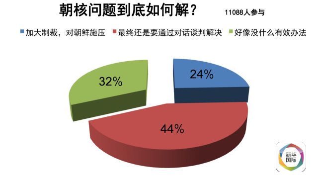 对朝核问题到底如何解的问题,中国网民中选择“最终还是要通过对话谈判解决”选项的最多,但仍有33%的网民选择“好像没什么有效办法”的选项。