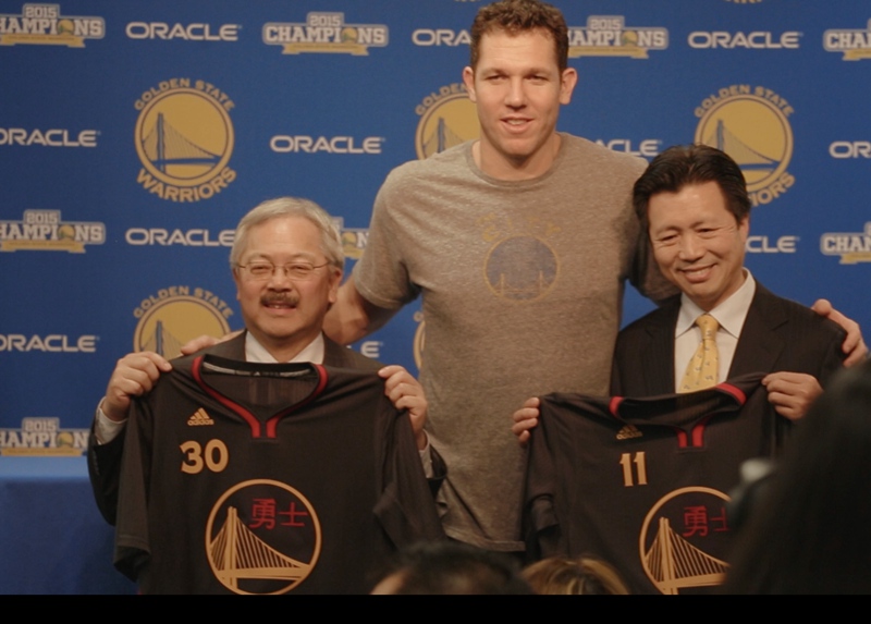 中国驻旧金山副总领事查立友、旧金山市长李孟贤与勇士队助理教练卢克.沃尔顿会面