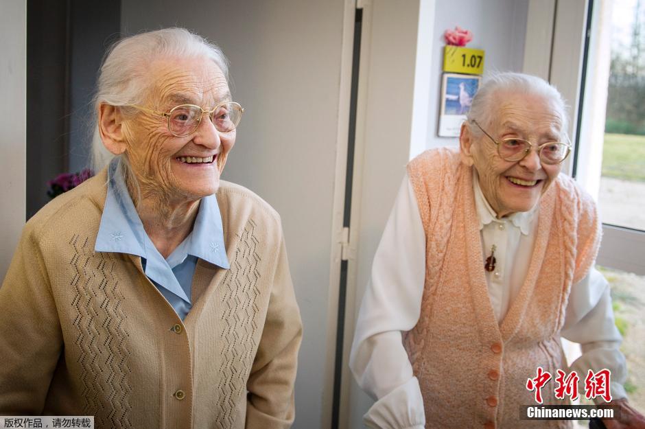 当地时间2016年2月11日,法国Onzain,百岁双胞胎Simone Thiot(左)和Paulette Olivier(右)。这两位老人出生于1912年1月30日11点,两姐妹现在已经104岁,被认为是在世的年龄最大的双胞胎。