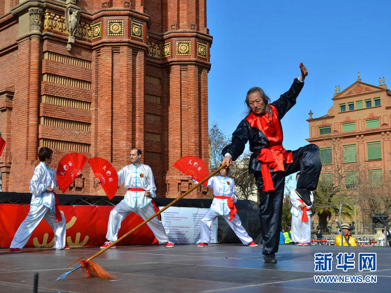 2月13日,在西班牙巴塞罗那,游行队伍带来武术表演。新华社发(贺耀龙摄)
