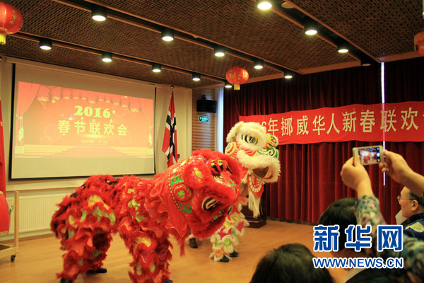 2月13日,挪威华人在表演庆新春舞狮节目。当天,挪威华人在首都奥斯陆举行2016年新春联欢会。众多华人欢聚一堂,共赏丰富的文艺表演。此次华人新春联欢会由挪威上海联谊会和潮州商会联合举办。新华社记者张淑惠 摄