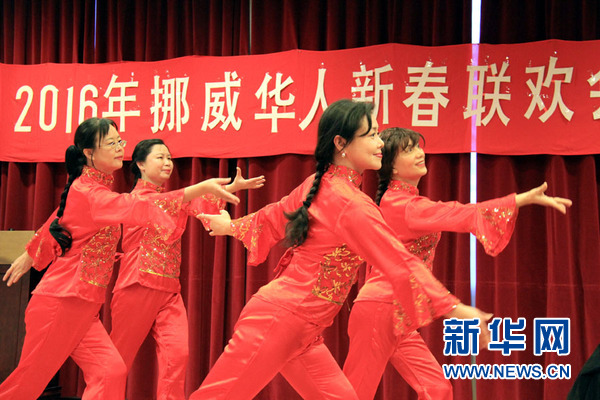 2月13日,挪威华人在进行民族舞蹈表演。当天,挪威华人在首都奥斯陆举行2016年新春联欢会。众多华人欢聚一堂,共赏丰富的文艺表演。此次华人新春联欢会由挪威上海联谊会和潮州商会联合举办。新华社记者张淑惠 摄
