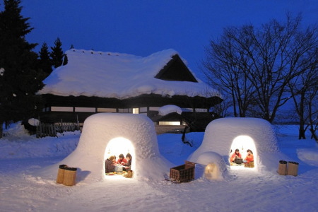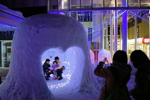 据报道,有的雪洞为配合情人节还布置成心形,在粉色灯光的映照下,许多情侣等前来拍照。日本儿童们坐在雪洞中,用方言招呼客人“请进”,并用甜酒和点心招待游客。