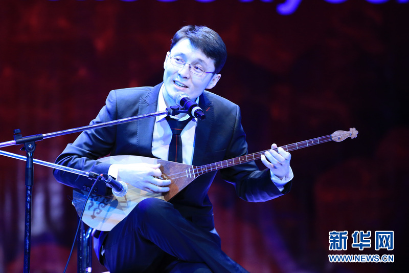 2月9日,在哈萨克斯坦阿拉木图,演员表演《冬不拉弹唱》。新华社发(米赫耶夫摄)