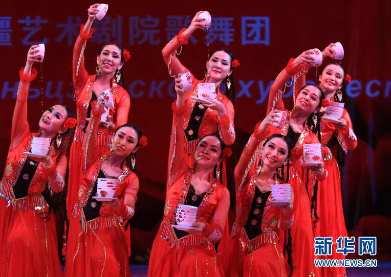 2月9日,在哈萨克斯坦阿拉木图,演员表演维吾尔族舞蹈《顶碗舞》。新华社发(米赫耶夫摄)