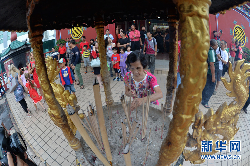 文莱华人和外国游客在腾云殿内进香祈愿。为庆祝中国猴年新春,文莱华人社团初一和初二在华人庙宇腾云殿以及街道上舞龙舞狮吸引了众多文莱人和外国游客驻足观看、拍照,一派喜气洋洋的过年气氛。新华社发(杰弗里·黄 摄)
