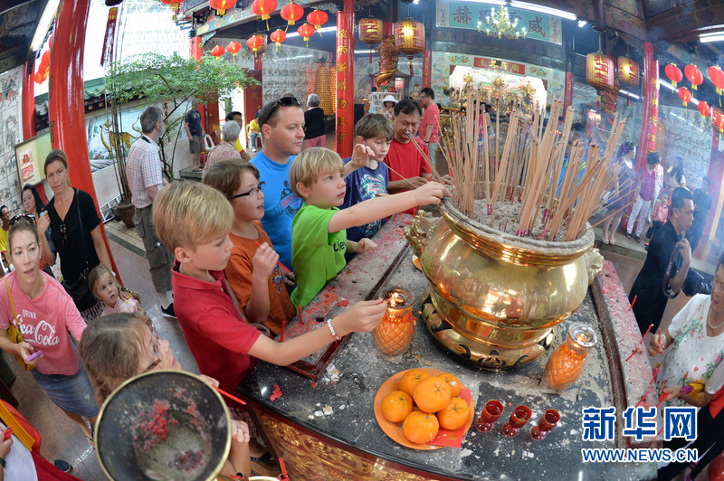 文莱华人和外国游客在腾云殿内进香祈愿。为庆祝中国猴年新春,文莱华人社团初一和初二在华人庙宇腾云殿以及街道上舞龙舞狮吸引了众多文莱人和外国游客驻足观看、拍照,一派喜气洋洋的过年气氛。新华社发(杰弗里·黄 摄)