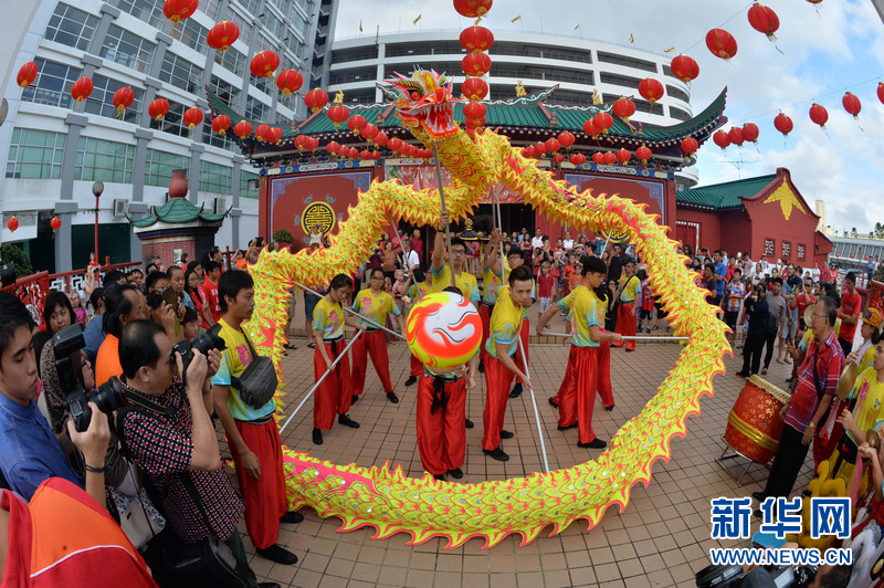 文莱华人表演舞狮舞龙。为庆祝中国猴年新春,文莱华人社团初一和初二在华人庙宇腾云殿以及街道上舞龙舞狮吸引了众多文莱人和外国游客驻足观看、拍照,一派喜气洋洋的过年气氛。新华社发(杰弗里·黄 摄)
