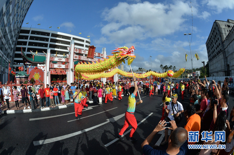 文莱华人表演舞狮舞龙。为庆祝中国猴年新春,文莱华人社团初一和初二在华人庙宇腾云殿以及街道上舞龙舞狮吸引了众多文莱人和外国游客驻足观看、拍照,一派喜气洋洋的过年气氛。新华社发(杰弗里·黄 摄)