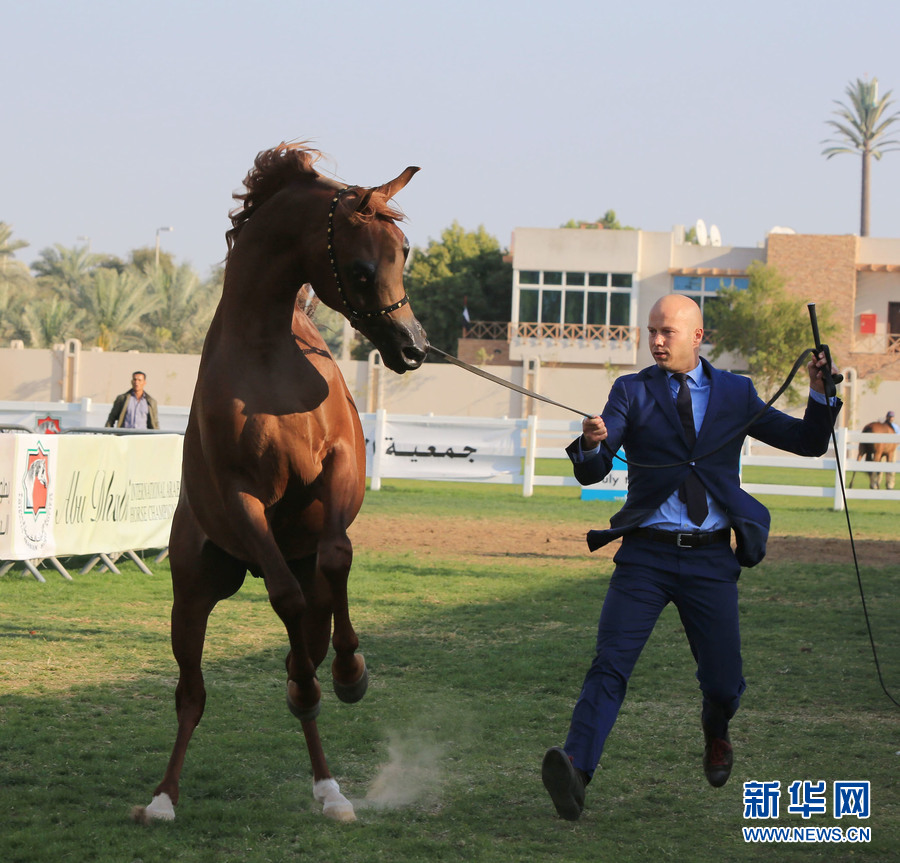 2月13日,驯导员牵领一匹马参加在阿联酋首都阿布扎比举办的2016阿拉伯纯种马“选美”国际锦标赛。新华网记者安江摄