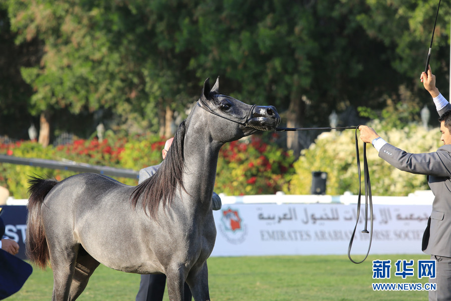 2月13日,驯导员牵领一匹马参加在阿联酋首都阿布扎比举办的2016阿拉伯纯种马“选美”国际锦标赛。新华网记者安江摄