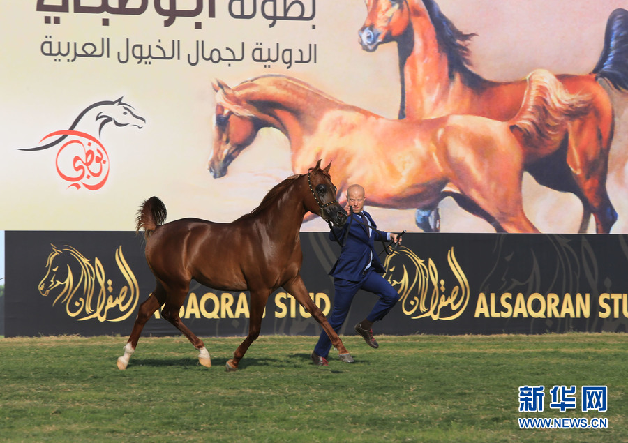 2月13日,驯导员牵领一匹马参加在阿联酋首都阿布扎比举办的2016阿拉伯纯种马“选美”国际锦标赛。新华网记者安江摄