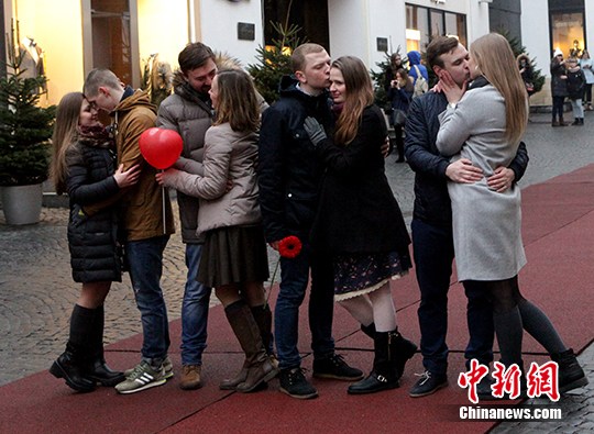 当地时间2月14日,在莫斯科红场附近,几对男女青年在街头摆出造型大秀恩爱。 中新社记者 王修君 摄