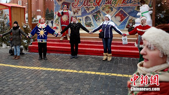 每年2月14日,是西方国家的情人节(又叫圣瓦伦丁节或圣华伦泰节)。当天在莫斯科红场上,几名演员与数对男女青年共同手拉手玩游戏,庆祝情人节。